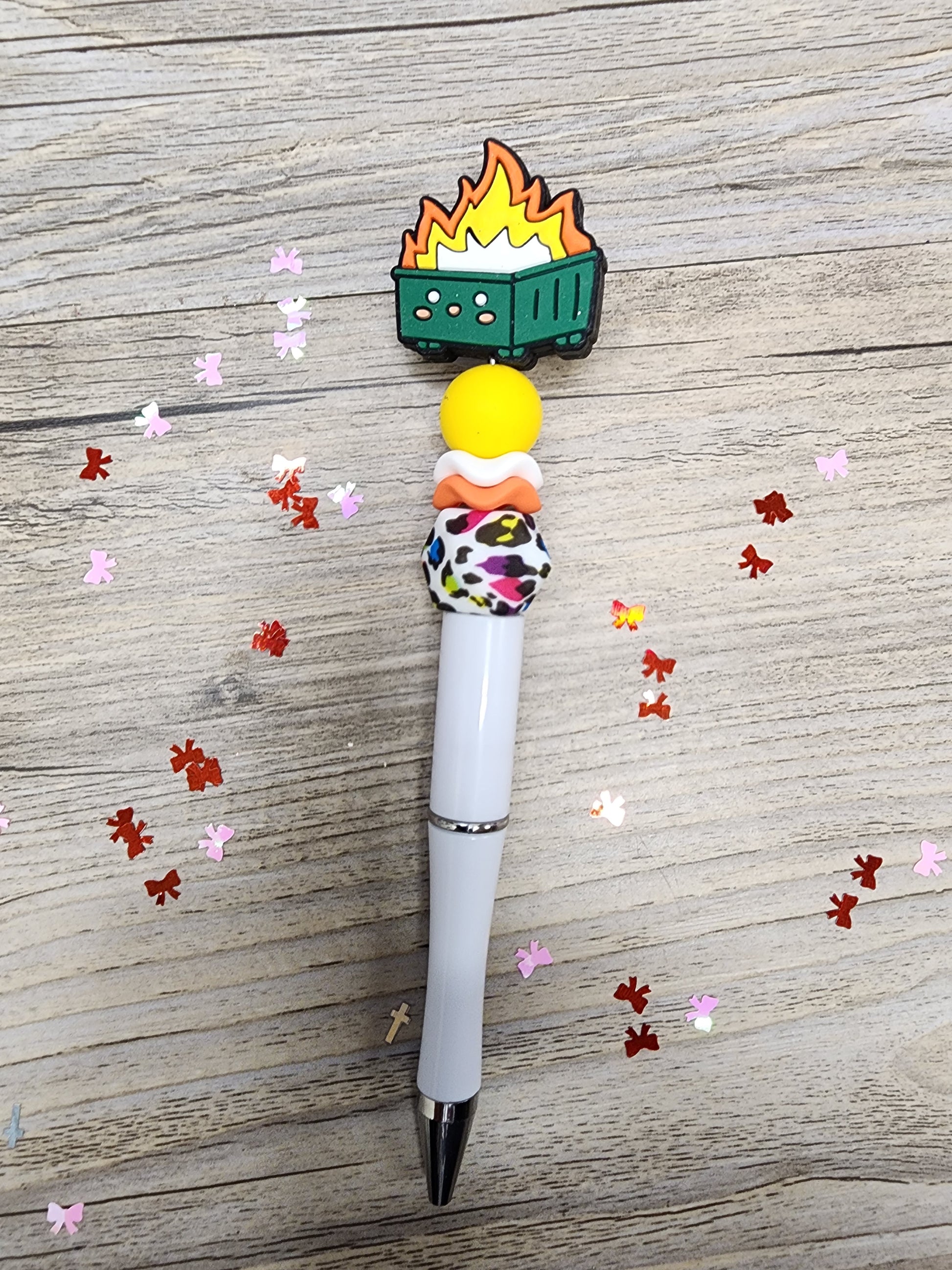 Handcrafted white pen featuring a fun dumpster fire focal bead, multicolor hexagon bead, orange and white acrylic spacers, and a yellow silicone bead. This unique pen combines humor and style, making it perfect for everyday use or as a conversation-starting gift. Each pen is carefully crafted with premium materials for smooth writing and lasting durability.